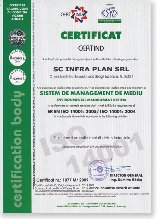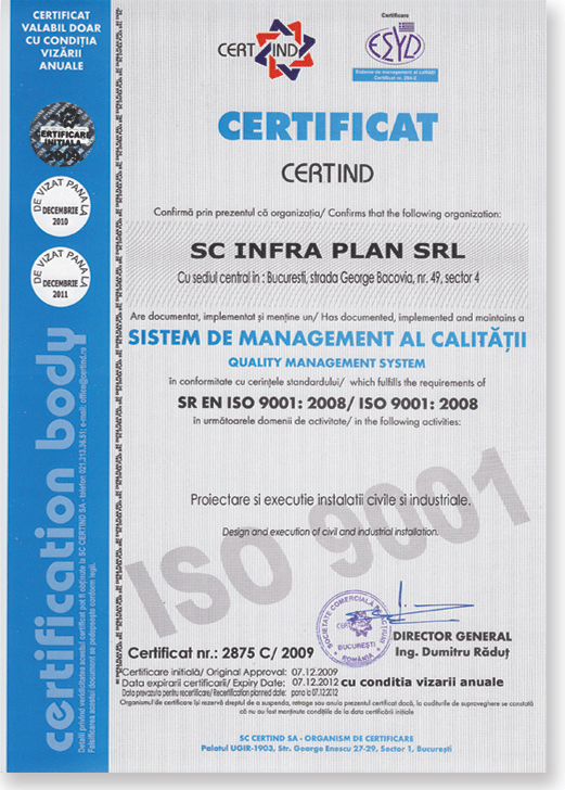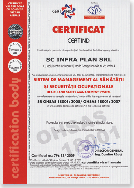 SC INFRA PLAN SRL - are implementat si OHSAS 18001 - standardul international pentru sistemul de management al sanatatii si securitatii ocupationale. Certificarea sistemului aducand companiei: imbunatatirea modului de percepere a organizatiei, precum si a relatiilor cu partenerii de afaceri si cresterea competitivitatii.